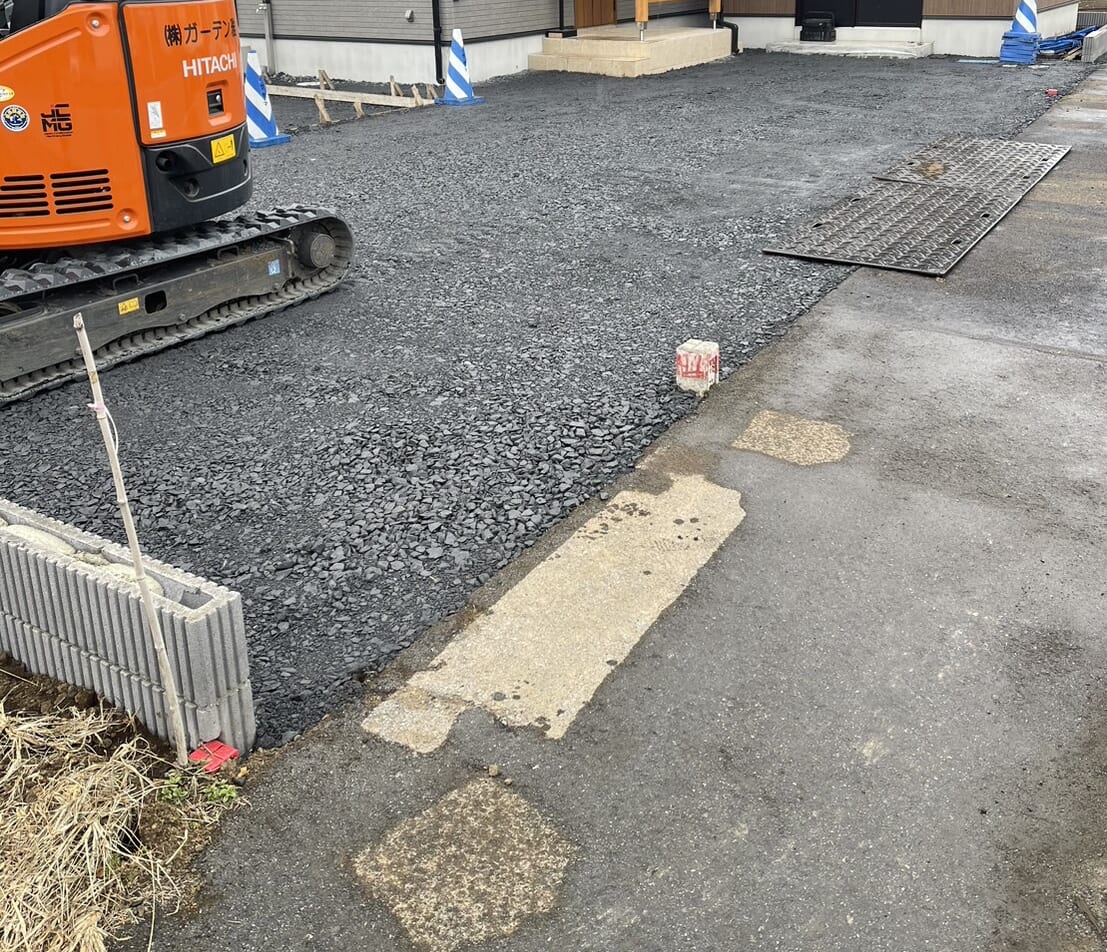 駐車場土間コンクリート下地砕石の転圧です。