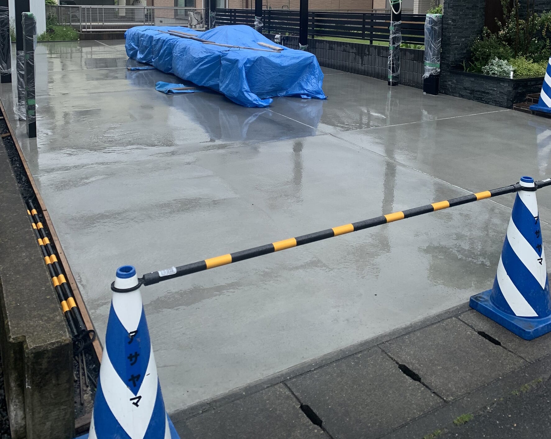 本日は雨の為に作業は休工となります。カーポート・ゲートの材料搬入後の雨養生となります。