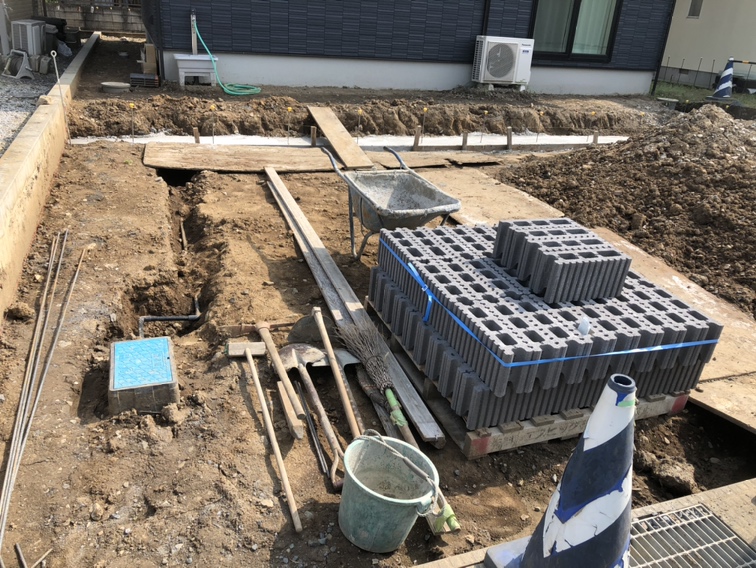 ブロックの材料も搬入となりましてブロック積み準備作業となります。