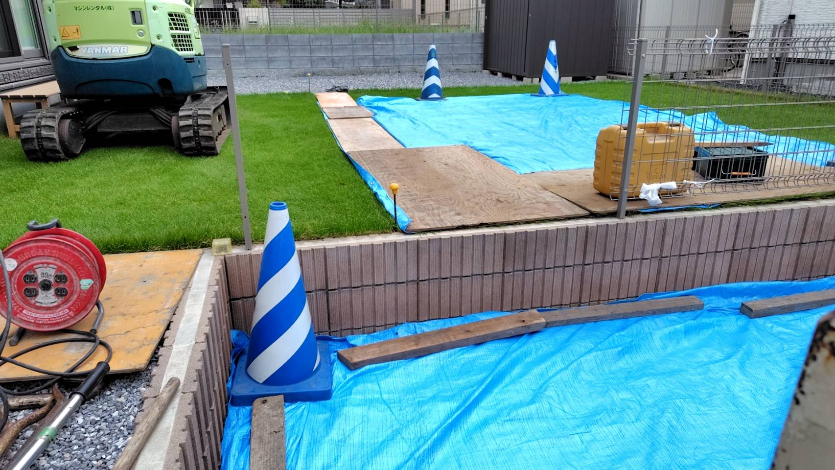 本日は駐車場の土間コンクリートの打設予定でしたが台風の影響により雨予報の為、コンクリート作業は延期となります。