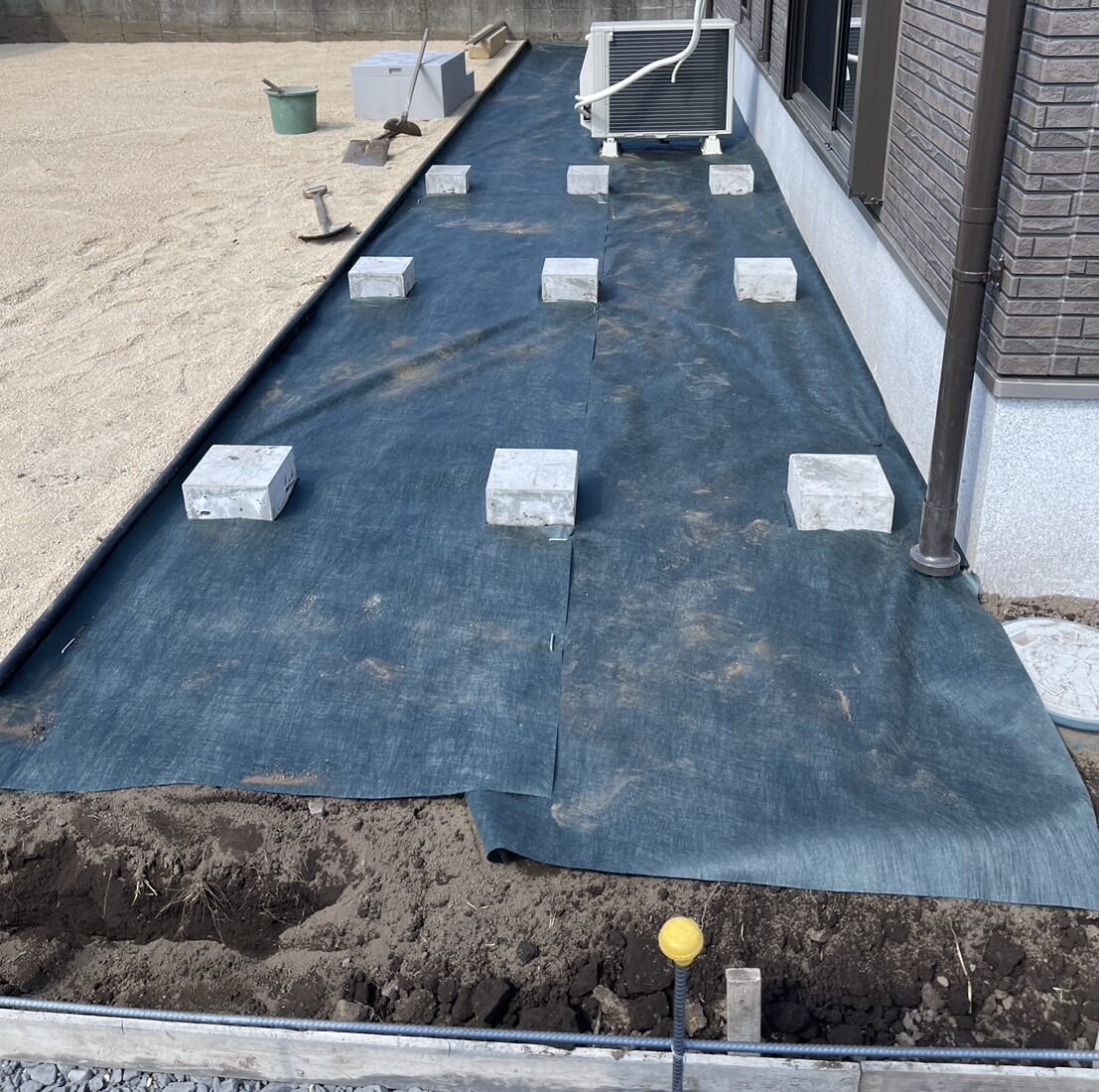 デッキ基礎石と防草シート施工です。