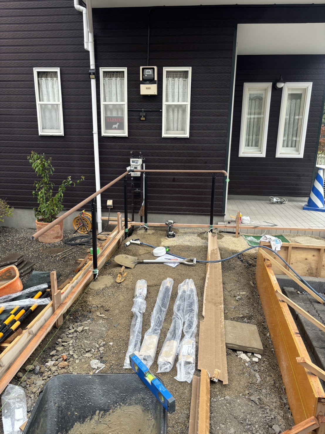 スロープ土間の手すりの取り付け中です。