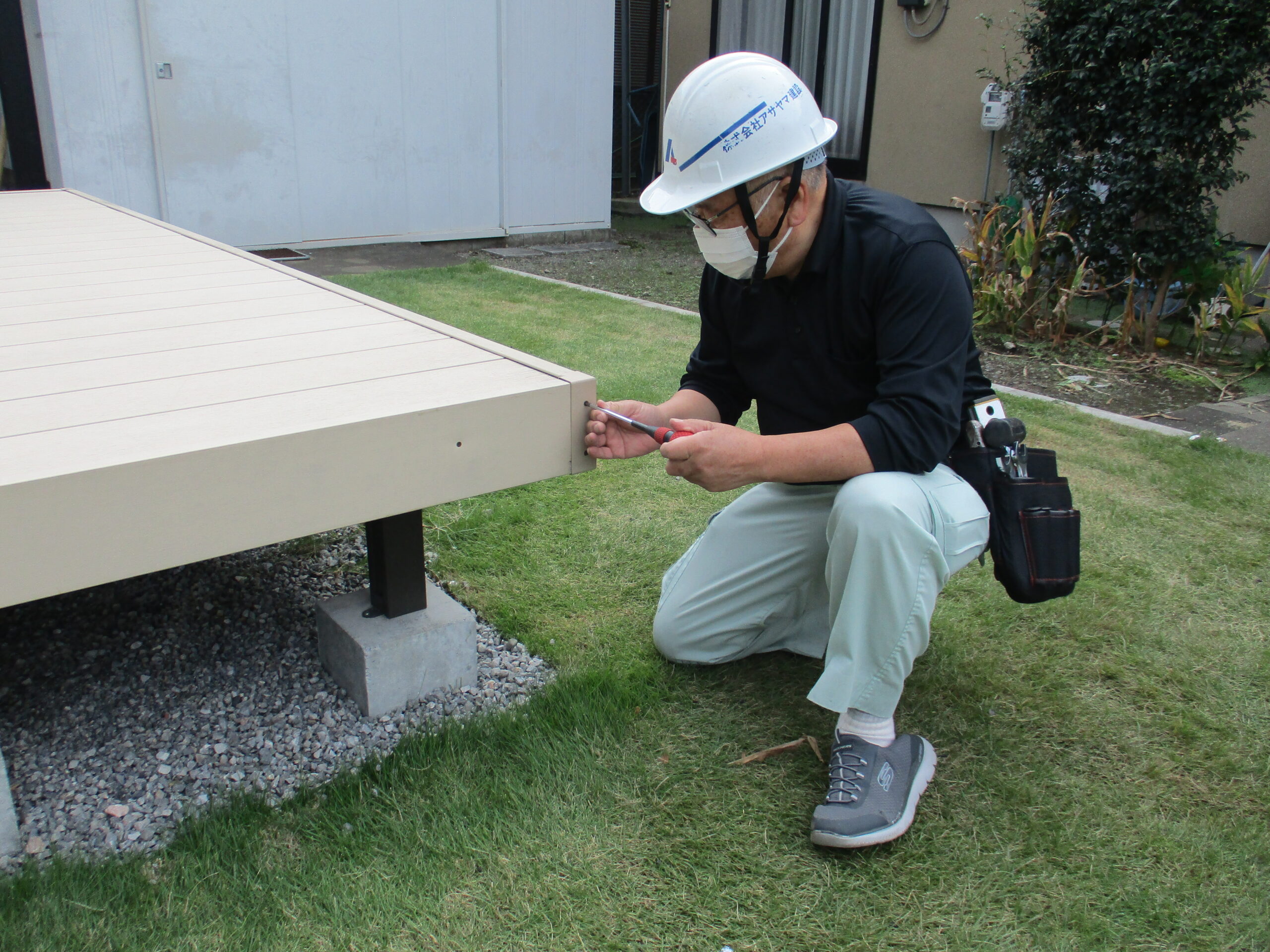 アフター3年点検にお伺い致しました。 ご主人様が対応してくれました。 樹ら楽ステージ、カーポート フーゴFミニ、ハイグリッドフェンス、アルメシュ門扉(片開き)の止めネジの増締めを行いました。 土間コンクリート、コンクリート縁石、スマートC、スロープ コンクリート、グラニート2連の打音検査による割れ確認。 デザイナーズパーツ枕木材の水平度を確認しました。 防草シート + 6号砕石の捲れ破れの確認。 天然芝 コウライ芝の成長確認しましたが特に問題ありませんでした。 ※上記項目の点検結果、防草シートの捲れ4箇所あったので補修致しました。 その他特に問題ありませんせした。