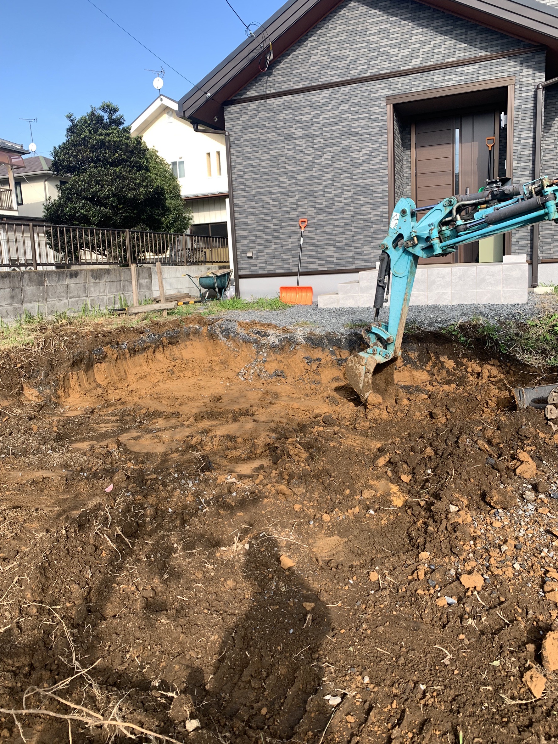 駐車場スペースの掘削作業です。重機を使用し作業していきます。
