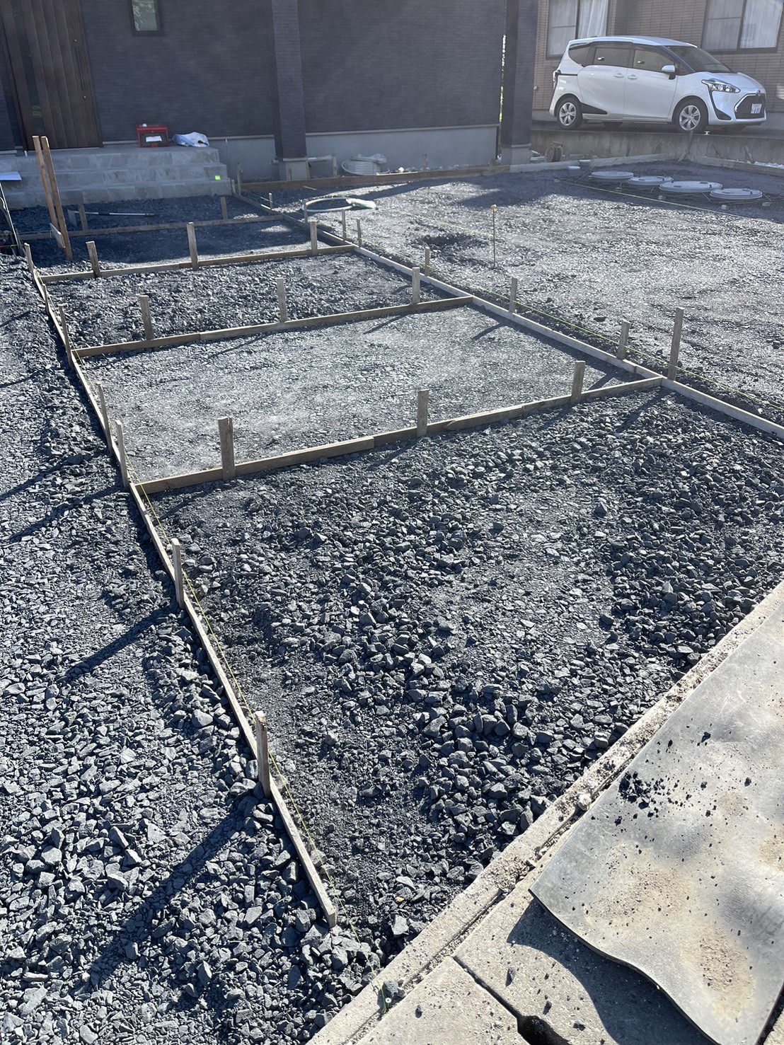 アプローチのインターロッキング舗装部分下地コンクリートの型枠みです。車が乗る可能性のある部分なのでインターロッキングの下にコンクリートを打設します。 外構ING 2024.11.07(最終更新 2024.11.07)