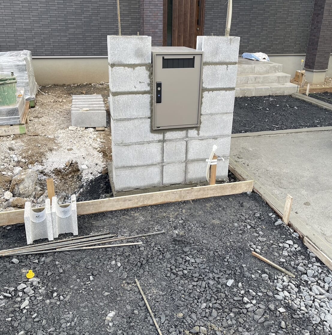 門袖部分のブロック積み及び埋め込み用の宅配ボックス・ポストの設置となります。