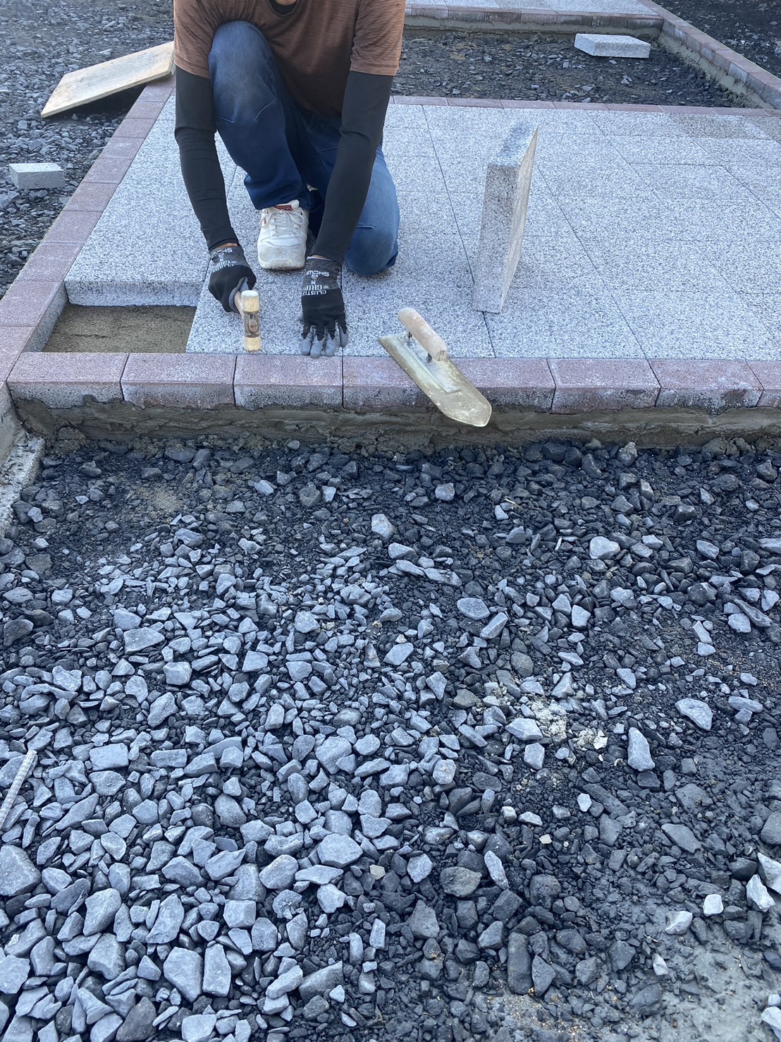 アプローチ部分の見切り及び300角の平板張り作業となります。