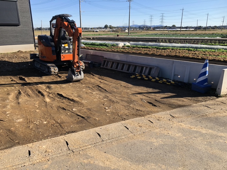 外構ING  本日より工事着工となります。重機を回送して掘削準備開始です。