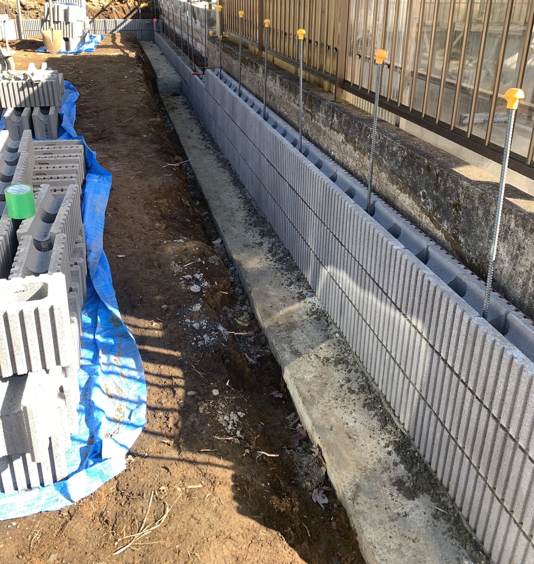 外構ING  駐車場の土止め部分のブロック積み作業となります。