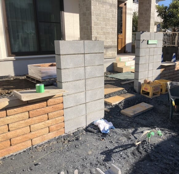 門袖部分のブロック積み作業となります。