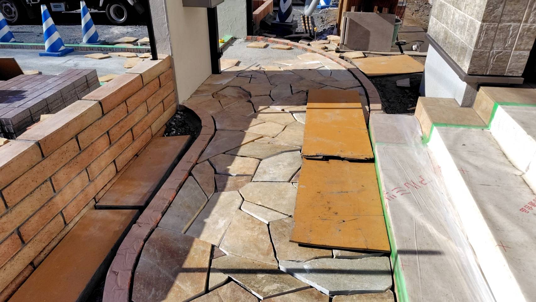 アプローチの天然石貼りです。仮並べしモルタルで貼り付けます。