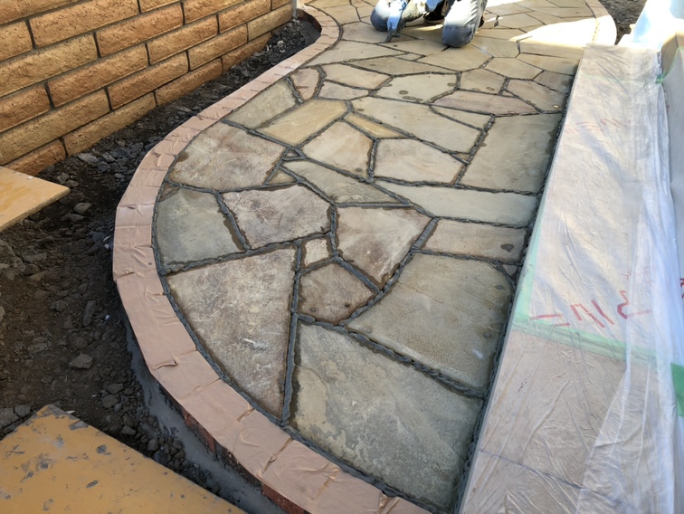 外構ING  アプローチの自然石乱張りの目地入れ作業となります。
