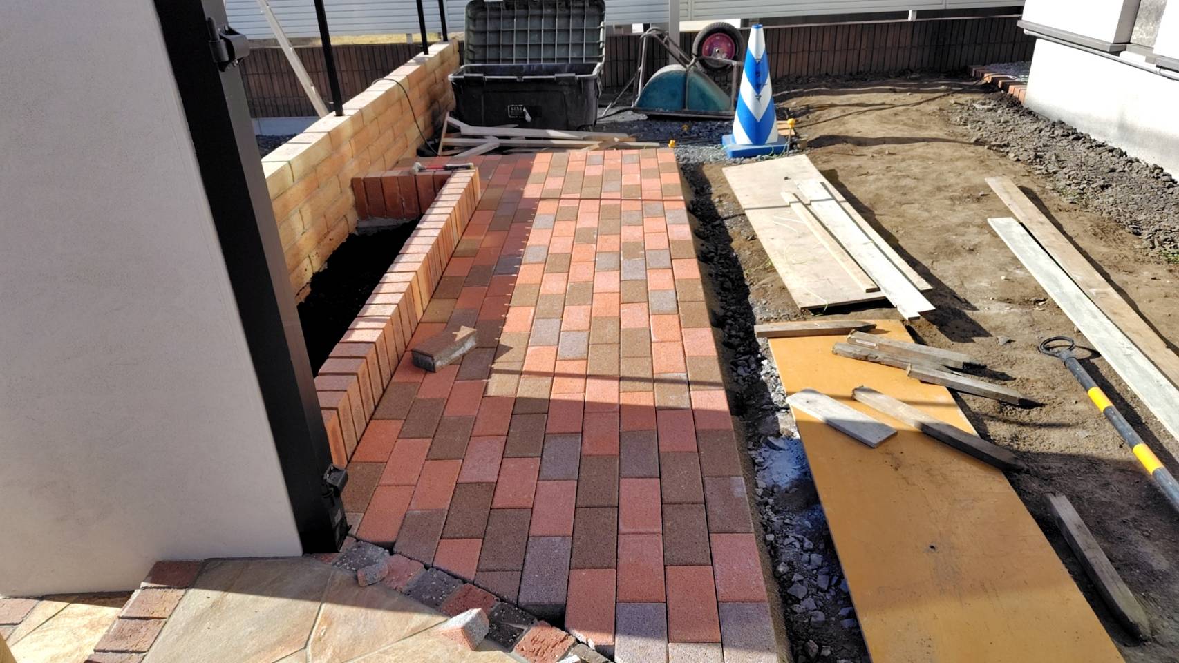 アプローチのインターロッキングの切り加工作業となります。アプローチ廻りの細物を加工して敷設して参ります。