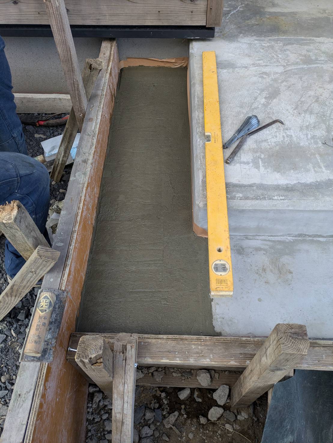 外構ING  階段部分のコンクリート仕上げとなります。少し時間を置いて面取り作業へと進めて参ります。