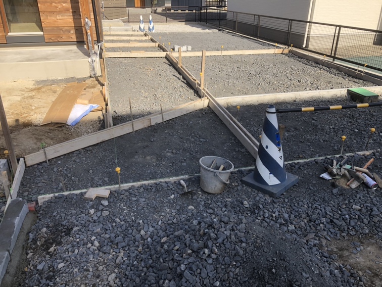 駐車場及びアプローチの型枠組み作業となります。