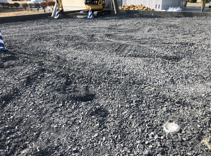 外構ING  本日はお客様のお引越しとなります。砕石入れまで完了しまして、お引越し準備完了です。