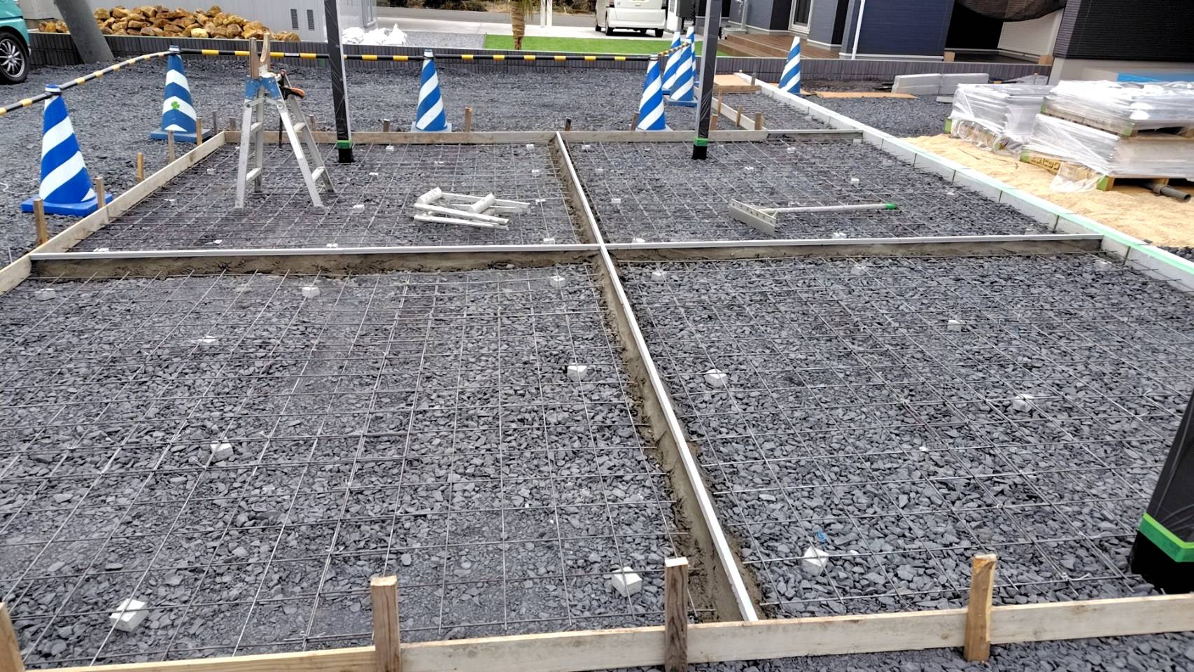 先日メッシュ筋をしきまして、土間コンクリート打設作業になります。