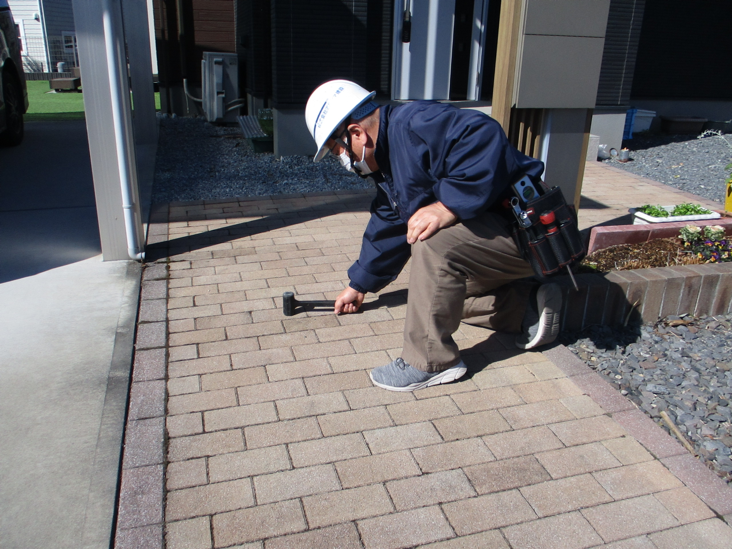 アフター5年点検にお伺い致しました。 奥様が対応してくれました。 土間コンクリート・アプローチ・レンガ小端立花壇・コンクリート縁石・ウルトラCの打音検査によるヒビ割れ歪み等の確認済み。 防草シート・人工芝の捲れ破れ等の確認済み。 イナバ物置・門柱(ポスト・表札)の水平度確認済み。 カーポート ・ ハイグリッドフェンス ・ 樹ら楽ステージの、増締め確認済み。 その他、アプローチの隙間が少し大きかったので、ジョイサンド ハードを入れて固めて来ました。 その他特に問題ありませんせした。