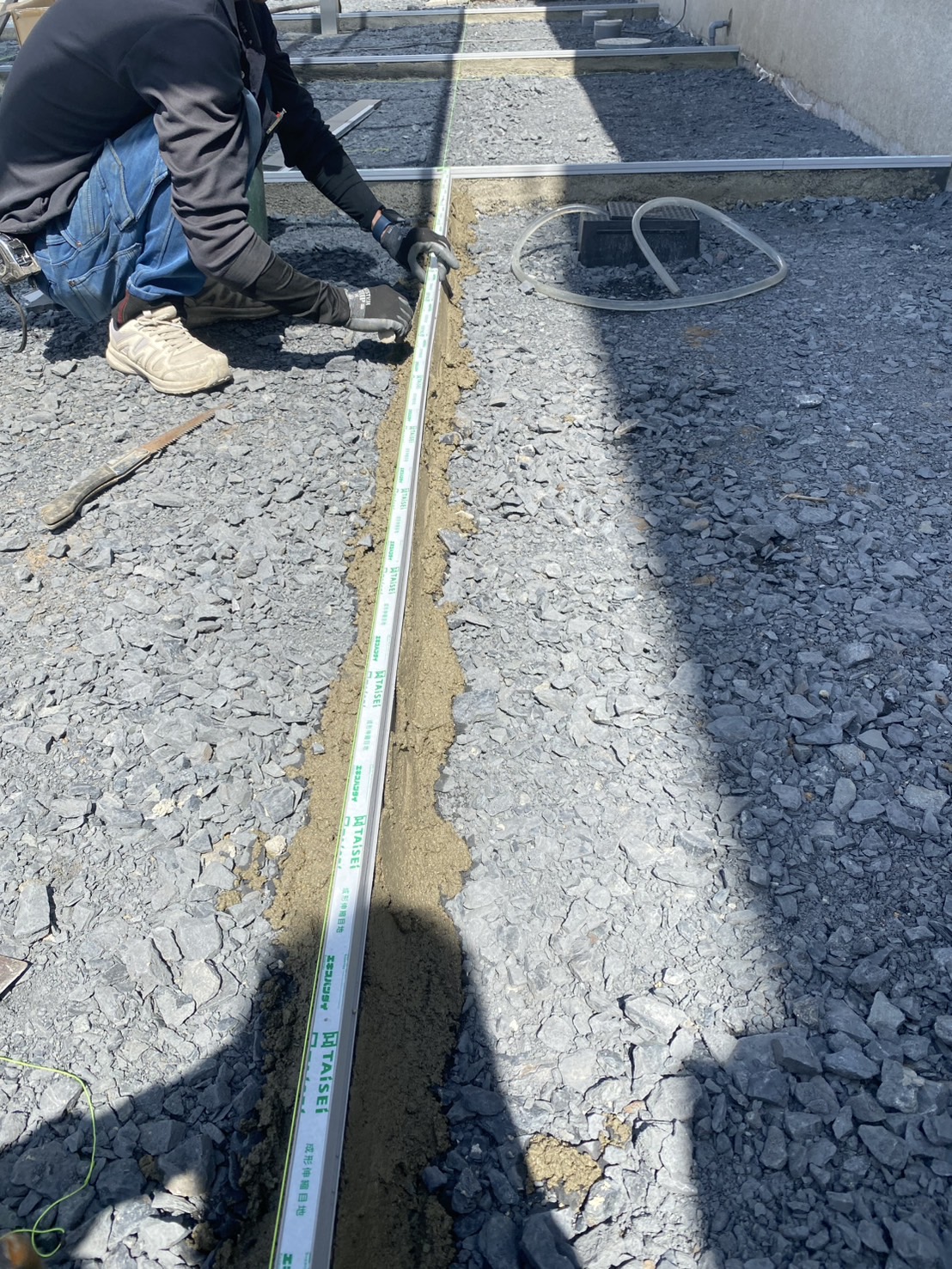 外構ING  土間コンクリート目地エキスパンタイ施工状況です。