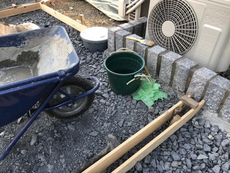 外構ING  花壇のグラニート小端建ての目地入れ作業となります。