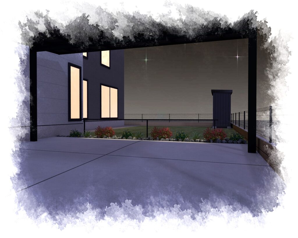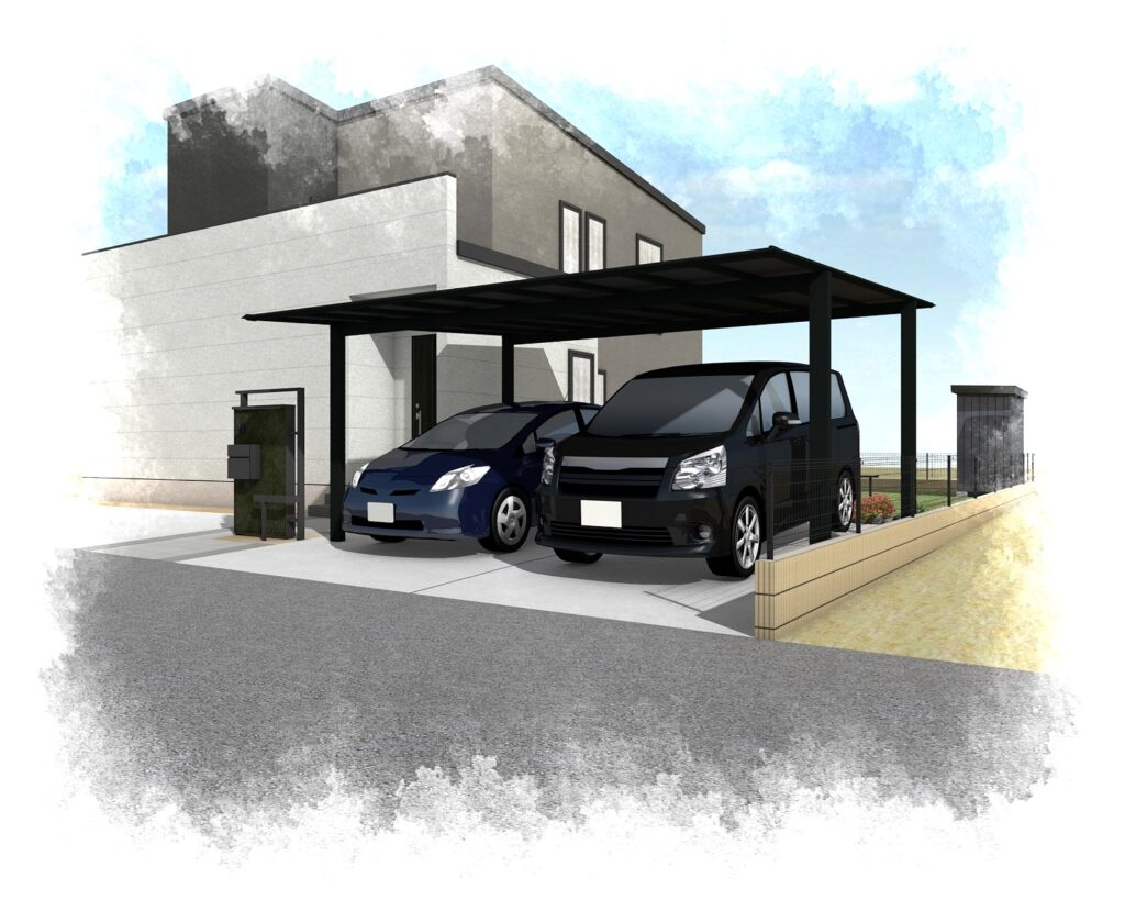 カーポートはブラックポリカを使用しモノトーンの外構に仕上がります。