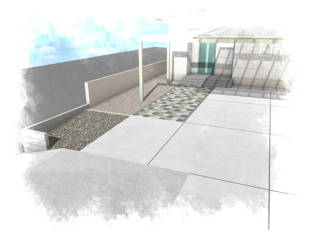 アプローチは6角形の平板敷きを施工します。