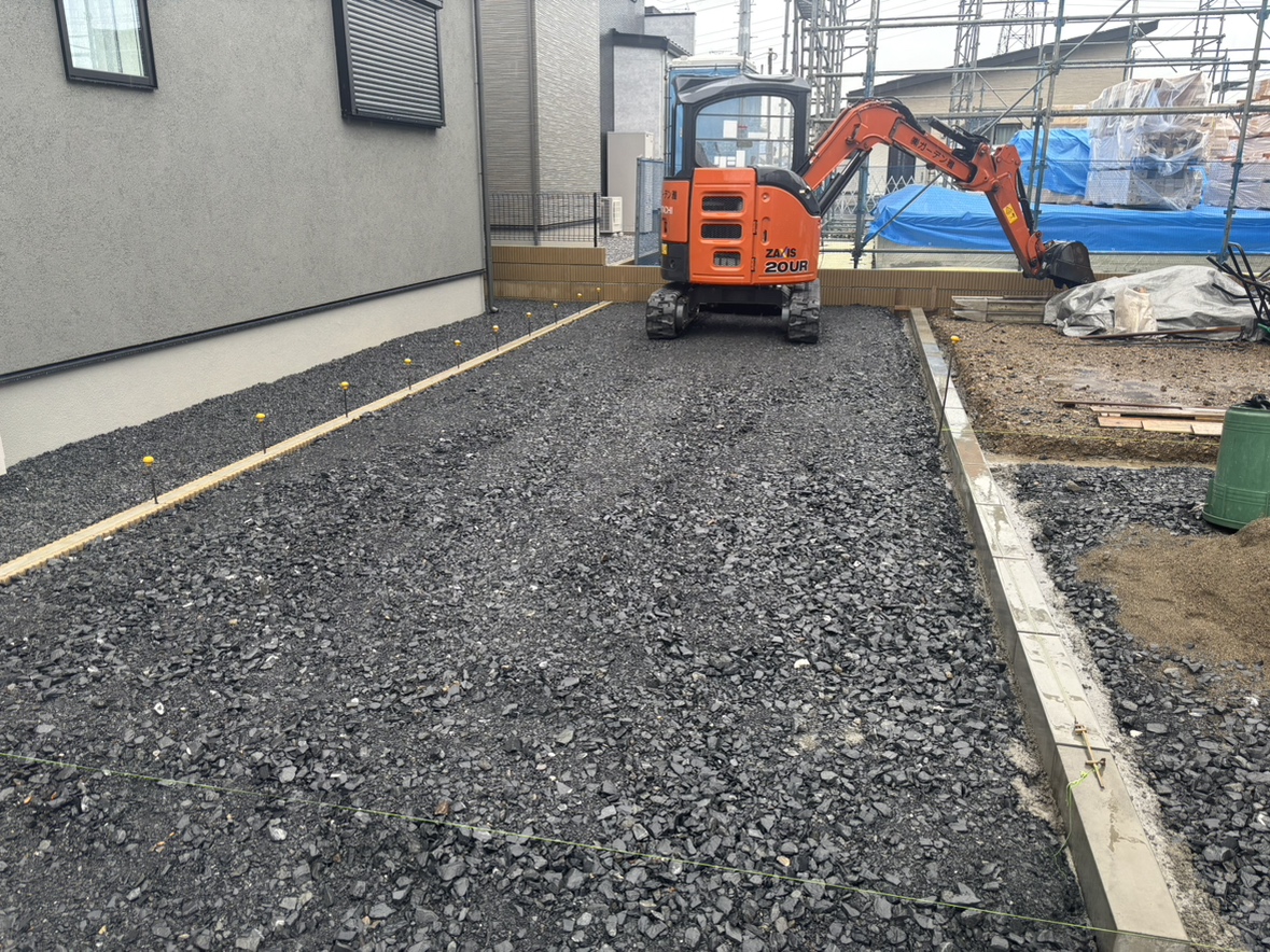 アプローチ・駐車場部分の砕石転圧及び型枠組み作業となります。