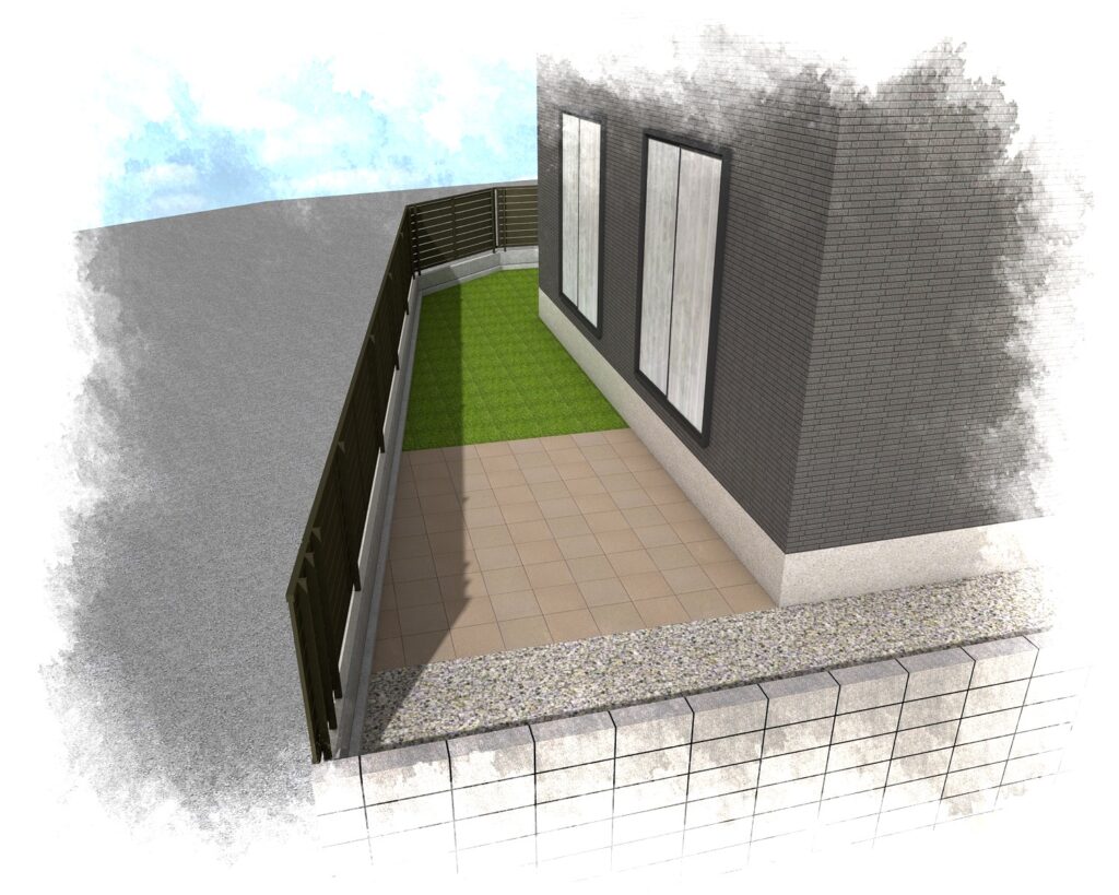 お庭はインターロッキングと人工芝で用途によって使い分けできます。