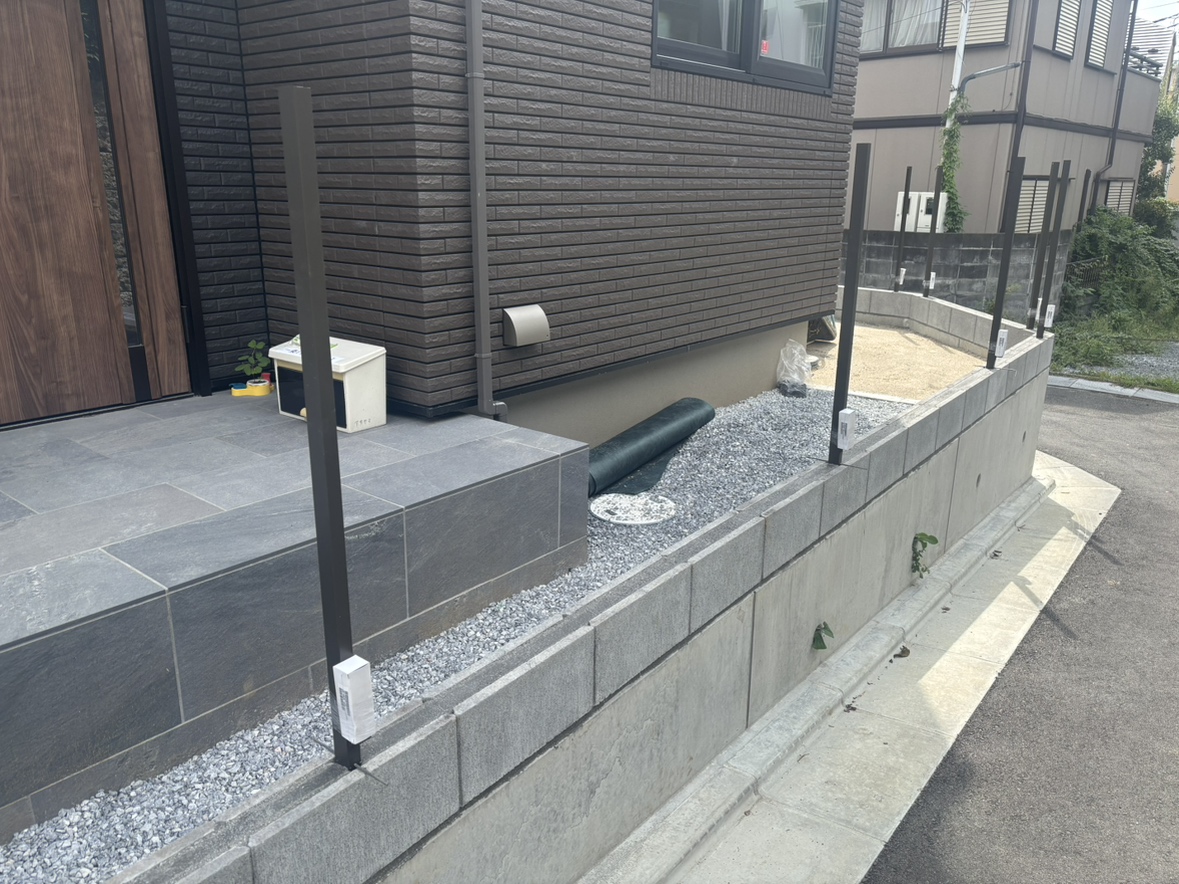 境界側のブロックのフェンスの柱の建て込み作業となります。
