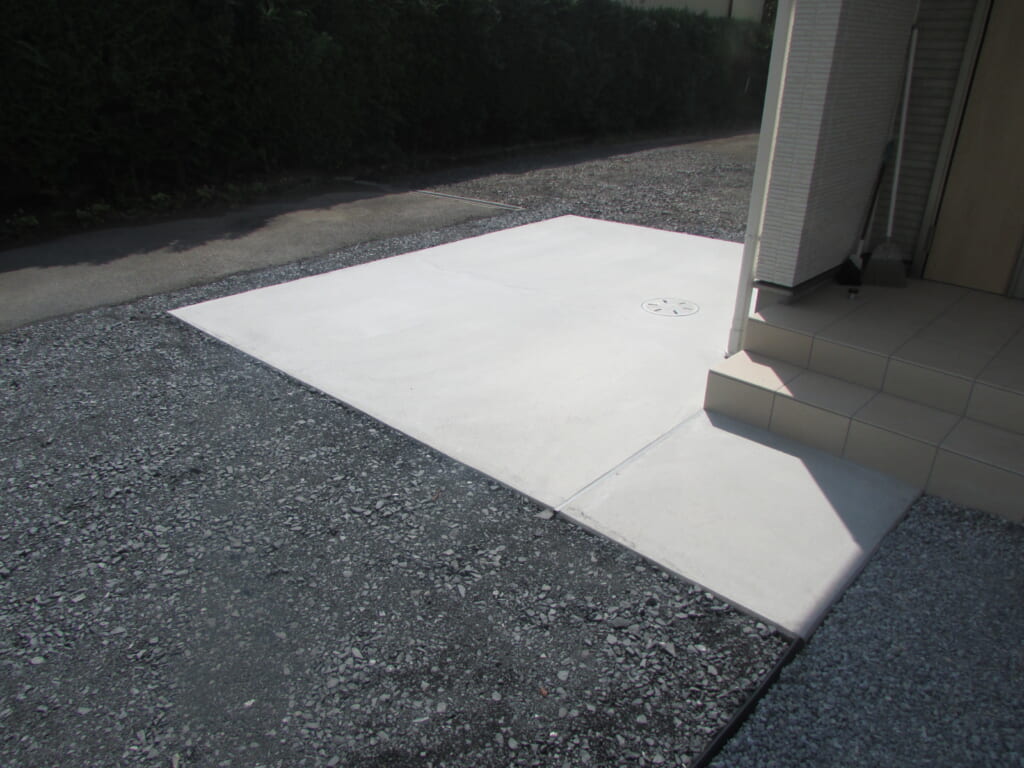 一部コンクリート打設とお庭を全体的に防草対策として防草シートと砂利敷きを施工しました。