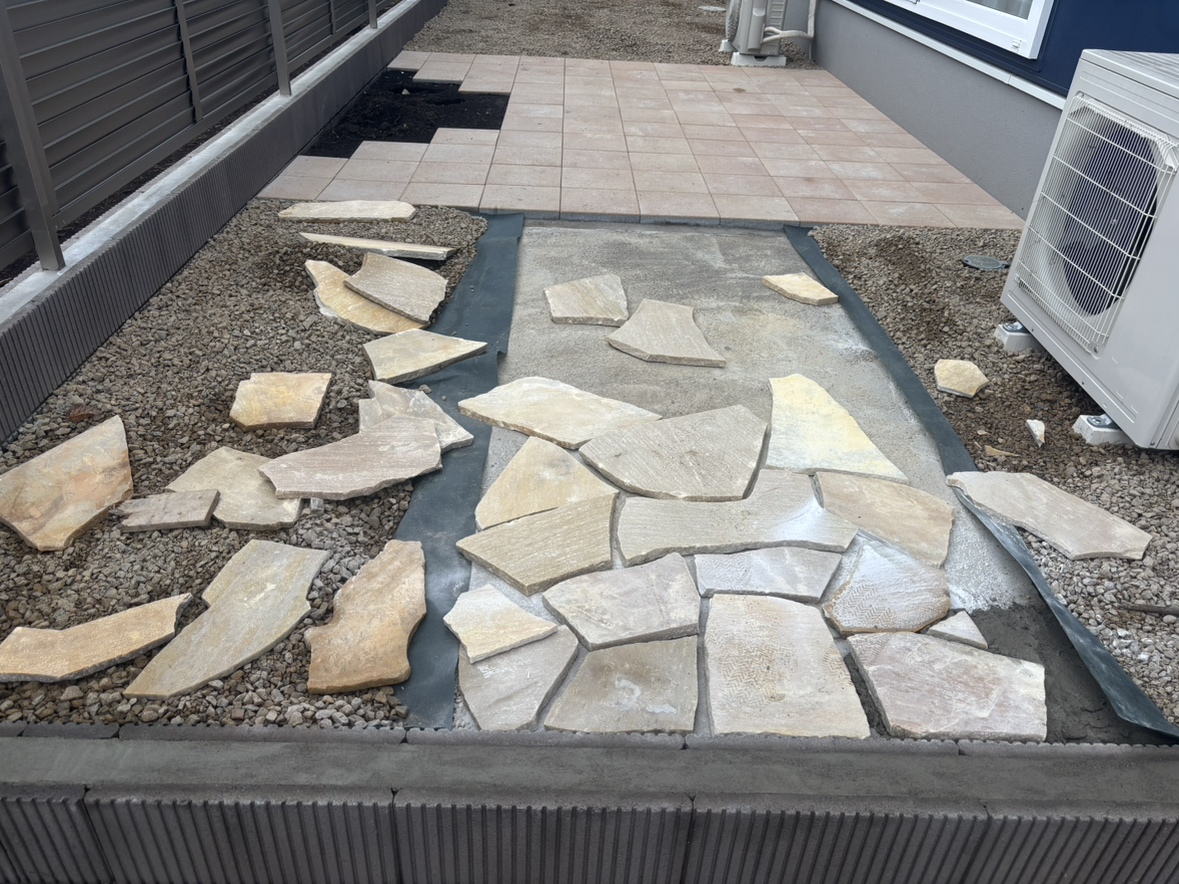 日光方面の寒さが一層厳しくなる中ですがお庭部分への自然石乱張り作業を進めております。