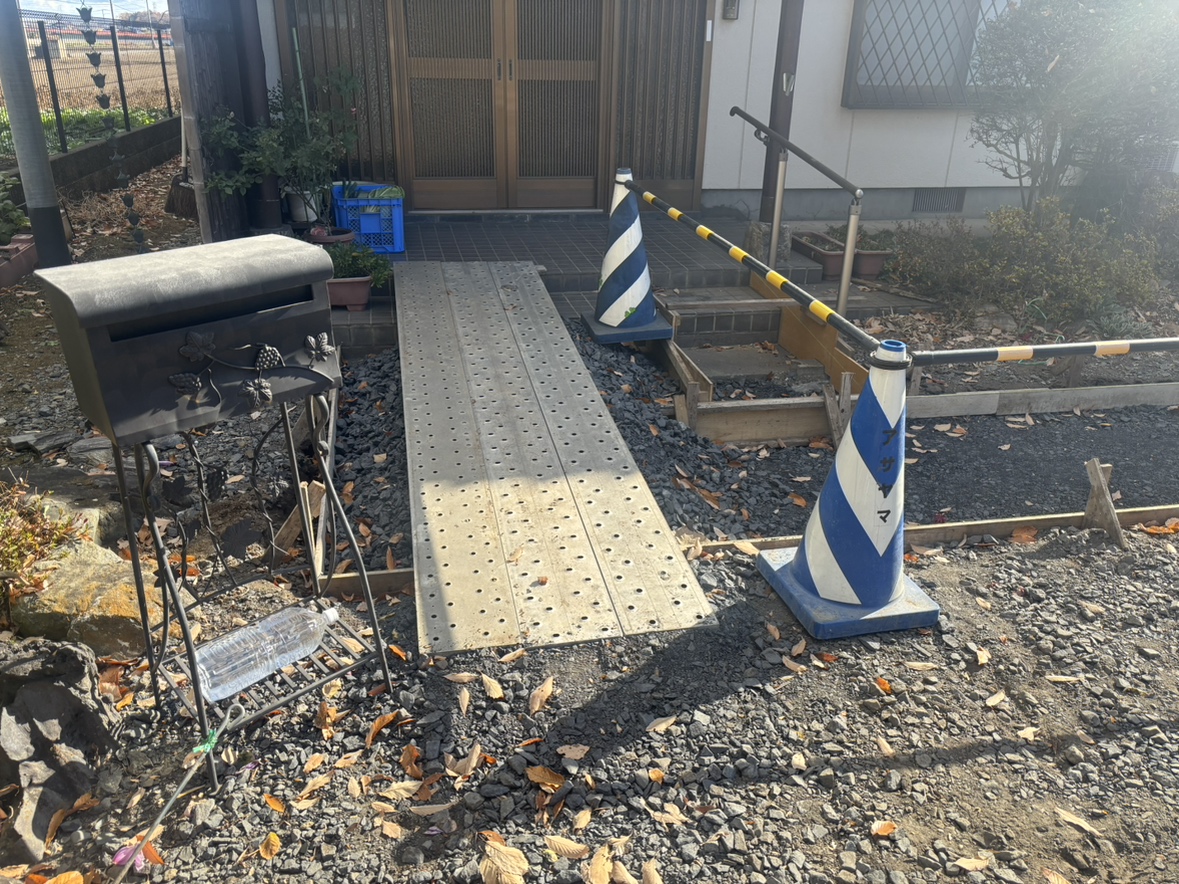 玄関出入りの通路部分に道板を渡しまして安全通路の手配を致しました。工事期間中はご不便をお掛け致しますが何卒よろしくお願い致します。 | ホームエクステリア『アサヤマ』