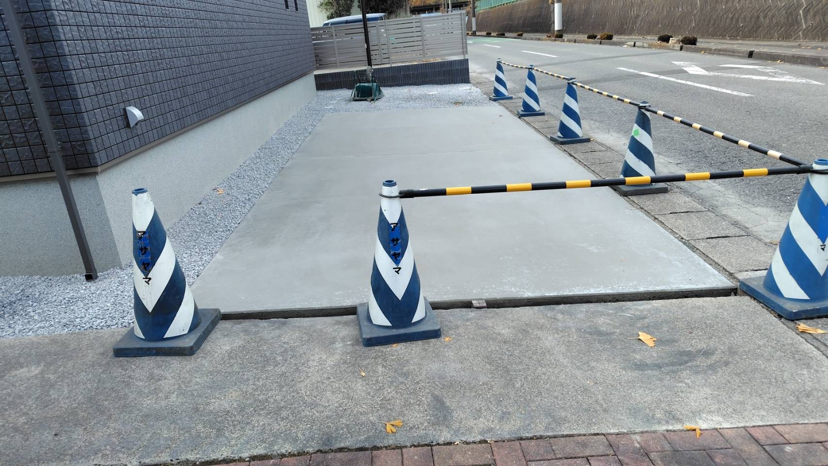 駐車場コンクリート打設後の脱枠作業となります。養生の方はもうしばらくの間、養生期間を取って参ります。