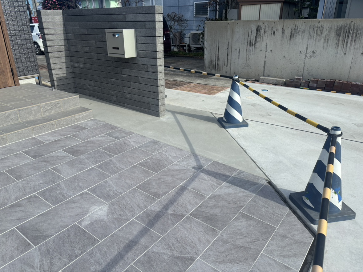 外構ING  門袖廻り部分のコンクリート打設後の養生中となります。工事作業の方も間も無く完了となります。