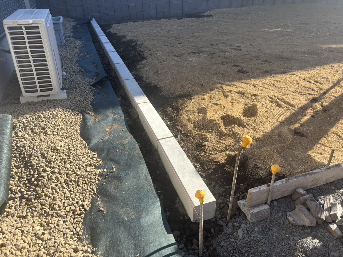 お庭側の見切りのコンクリートの縁石を敷設して参ります。お庭は来年の春に芝張り予定です。