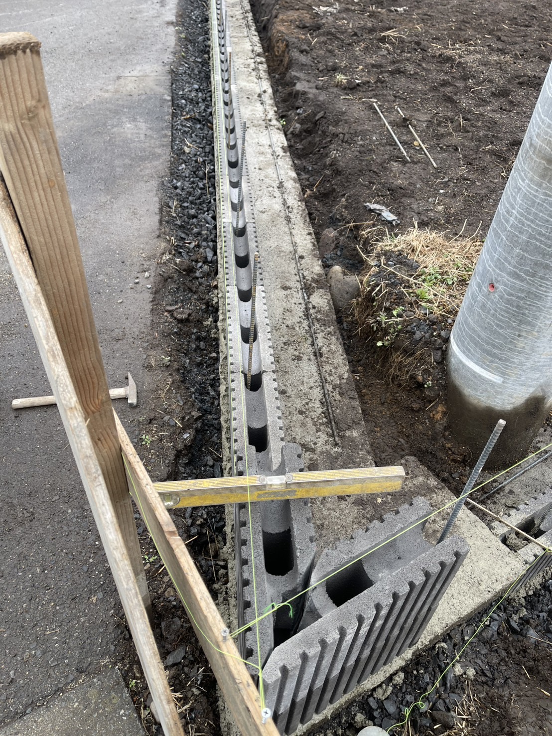 外構ING  南側と西側の境界側のブロック積み作業開始となります。