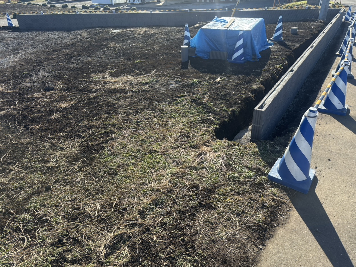 外構ING  南西側の境界側のブロック積み作業後の養生中となります。次はガレージ側のコンクリートの打設準備となります。