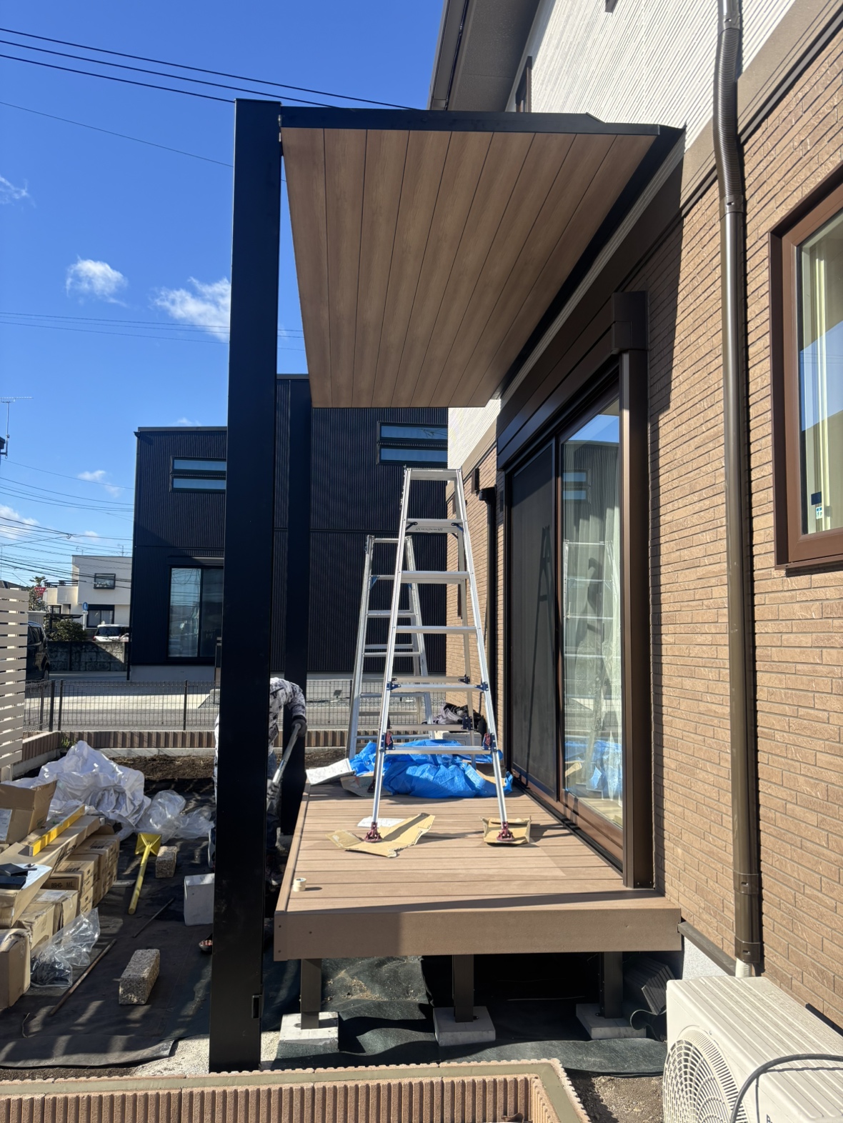 テラス部分の屋根張り作業となります。時折強風が吹き込む時もあり資材の飛散防止に努めて作業を進めて参ります。