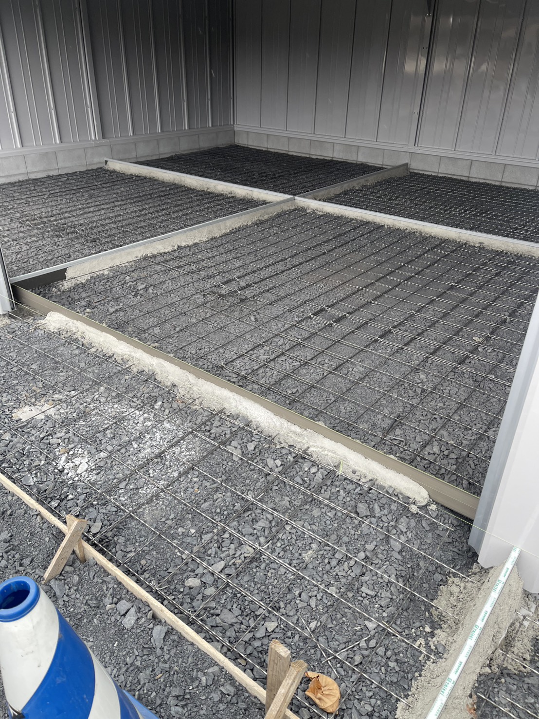 本日はガレージのコンクリートの打設作業となります。メッシュ筋を敷いてコンクリートミキサー車の到着を待ちます。 | ホームエクステリア『アサヤマ』