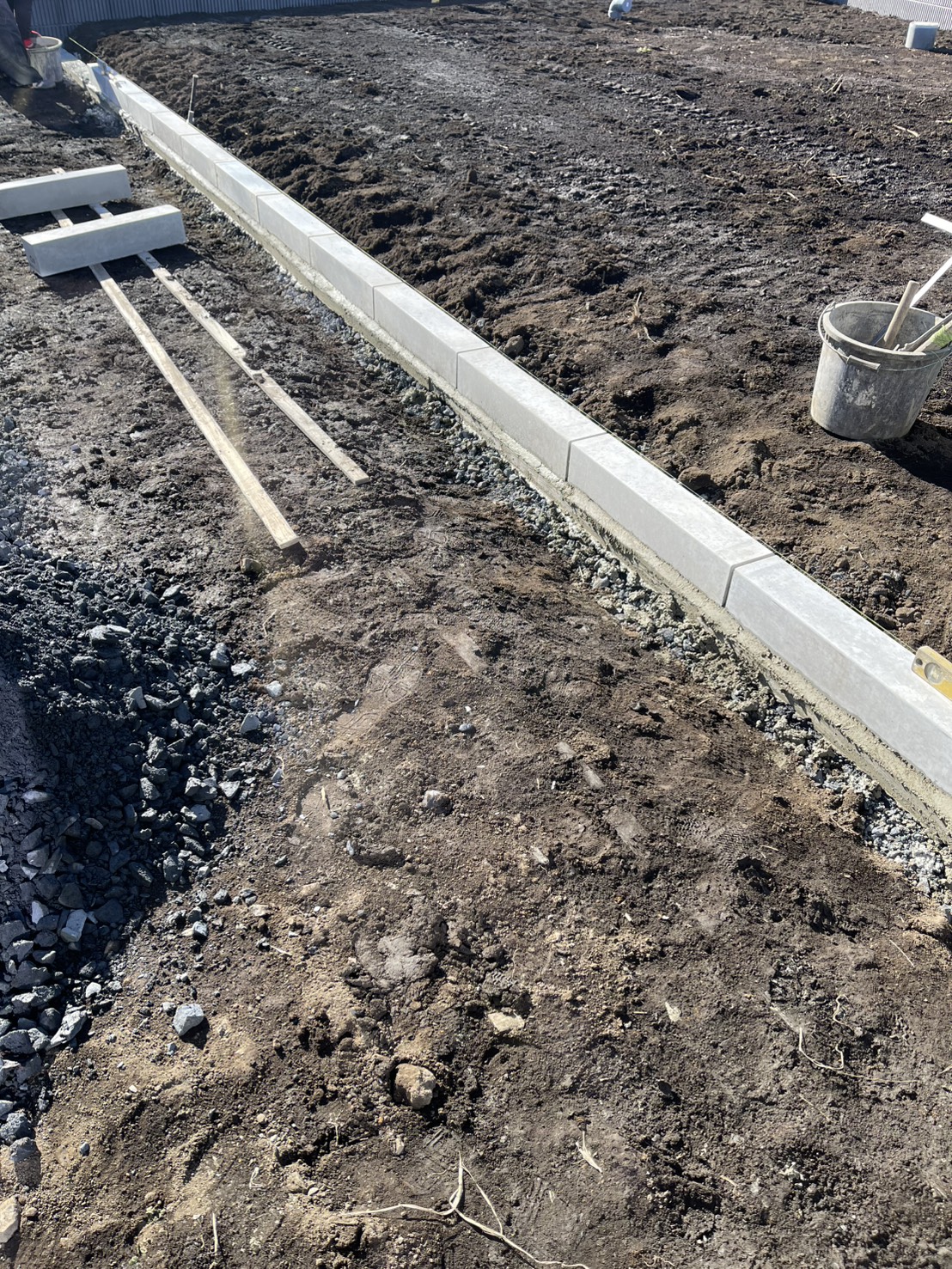 門袖廻りのインターロッキングの見切りの敷設となります。門袖はタイル張りとなりますので下地作業の方は準備完了です。