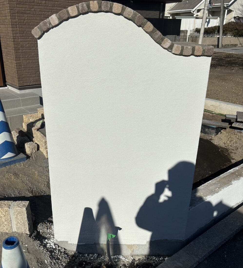 門袖のビブロの塗り壁作業となります。正面側を仕上げまして来週には反対側の塗り壁作業となります。