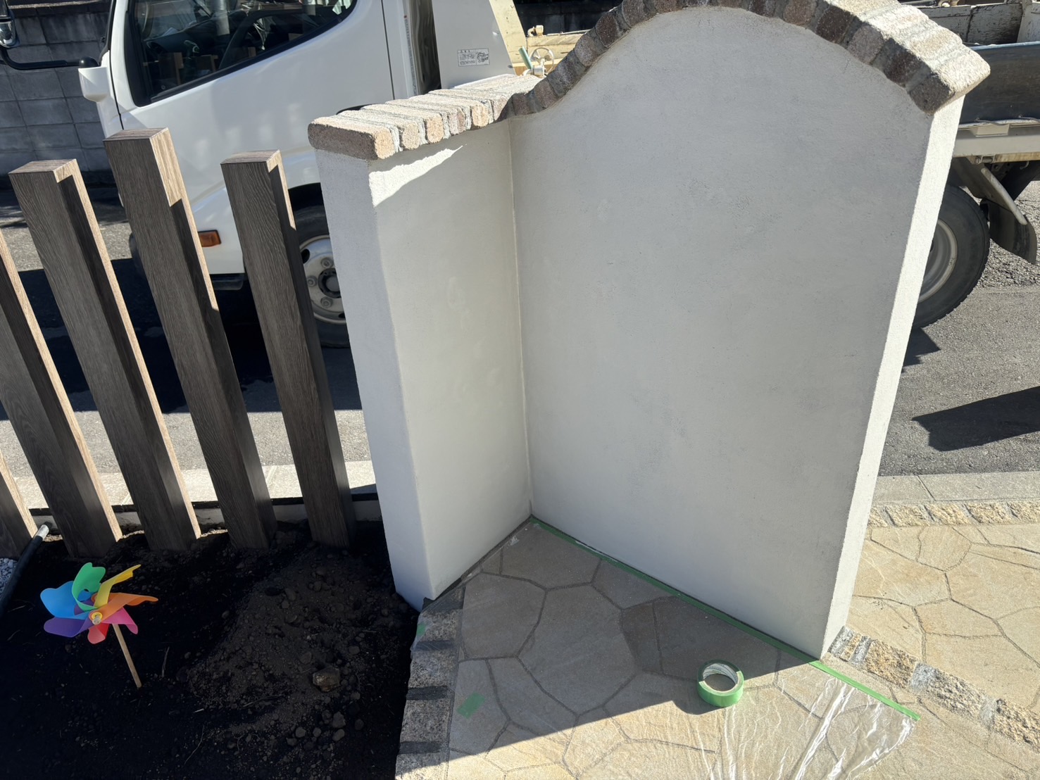 玄関側の門袖の塗り壁ビブロ塗り作業となります。お天気にも恵まれて作業完了です。