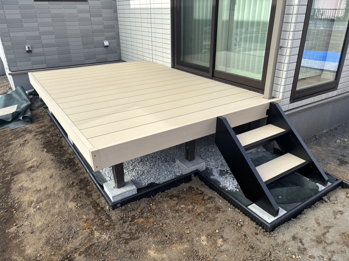 テラスのウッドデッキの設置作業となります。テラス部分が仕上がり出入りがしやすくなりました。
