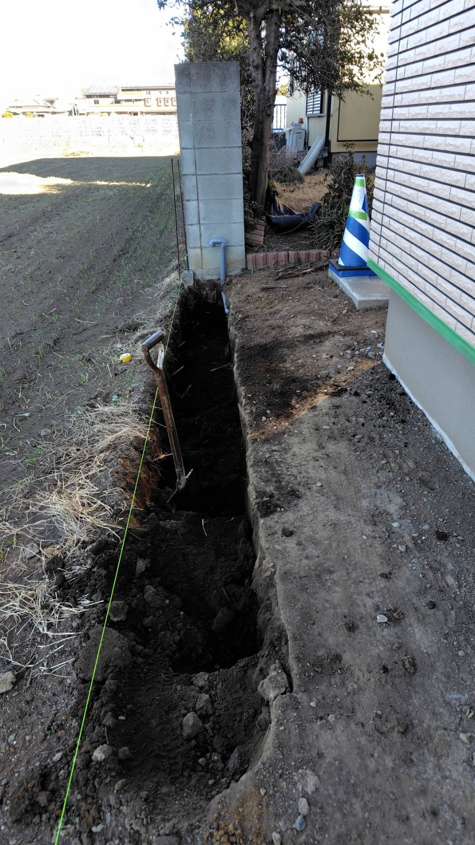 西側の境界ブロック部分の掘削作業となります。隣地側の畑の取り合いを慎重に手掘り作業にて進めて参ります。ブロックベースの掘削です。