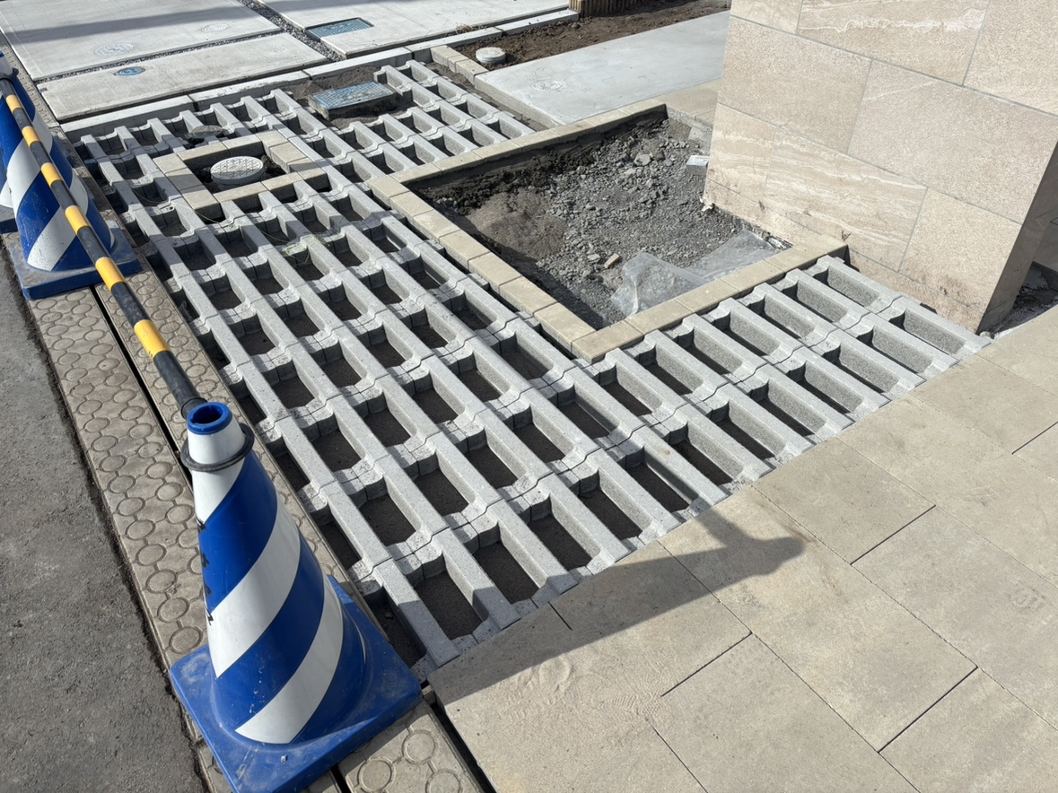 アプローチ門袖前のグラスハイブリックボーダーの敷設作業となります。