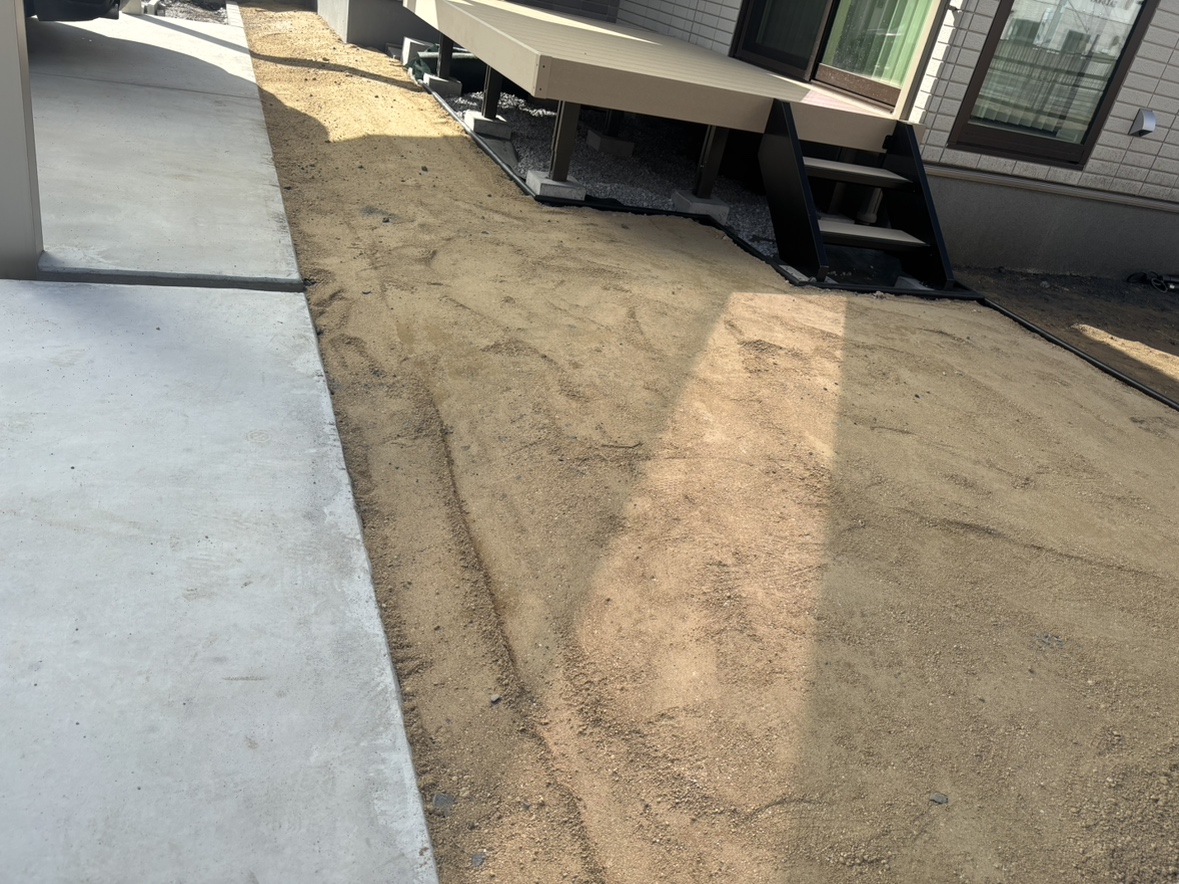 外構ING  ウッドデッキ廻りの人工芝下地の為の山砂を搬入しまして転圧の作業中となります。
