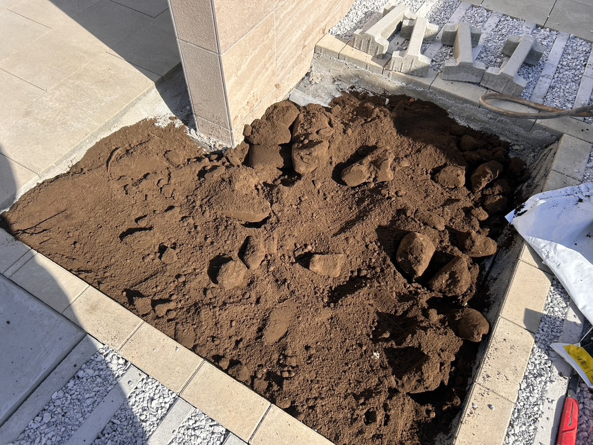 花壇部分への黒土入れの作業となります。