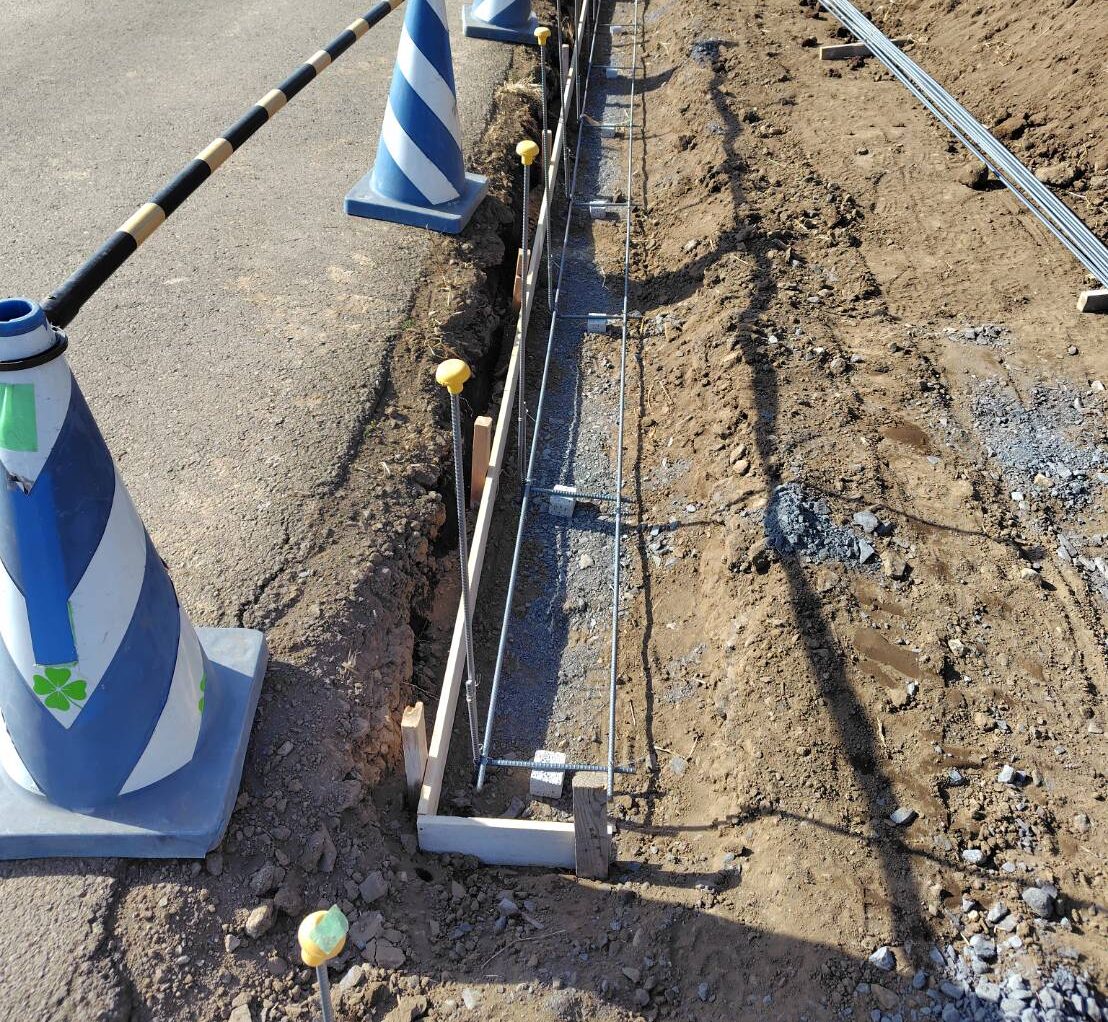 外構ING  境界側と門袖のブロック積み部分への配筋組みの作業となります。