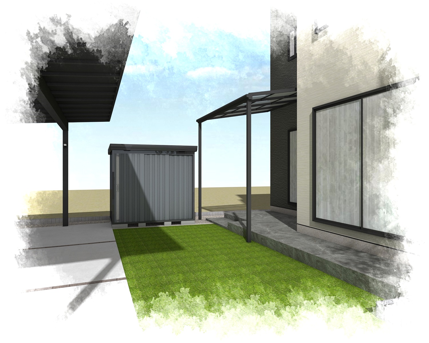 カーポートはブラックポリカで汚れが目立ちにくく、お庭の人工芝や門柱のタイルもお手入れを最小限に抑えられます。お庭横の物置は目隠し代わりにも活用できそうです。