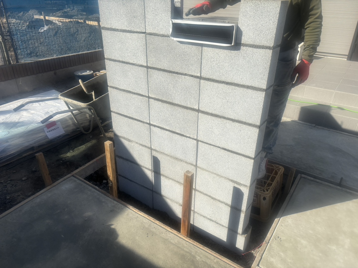 玄関前のアプローチ部分のタイル張り下地のブロック積み作業となります。